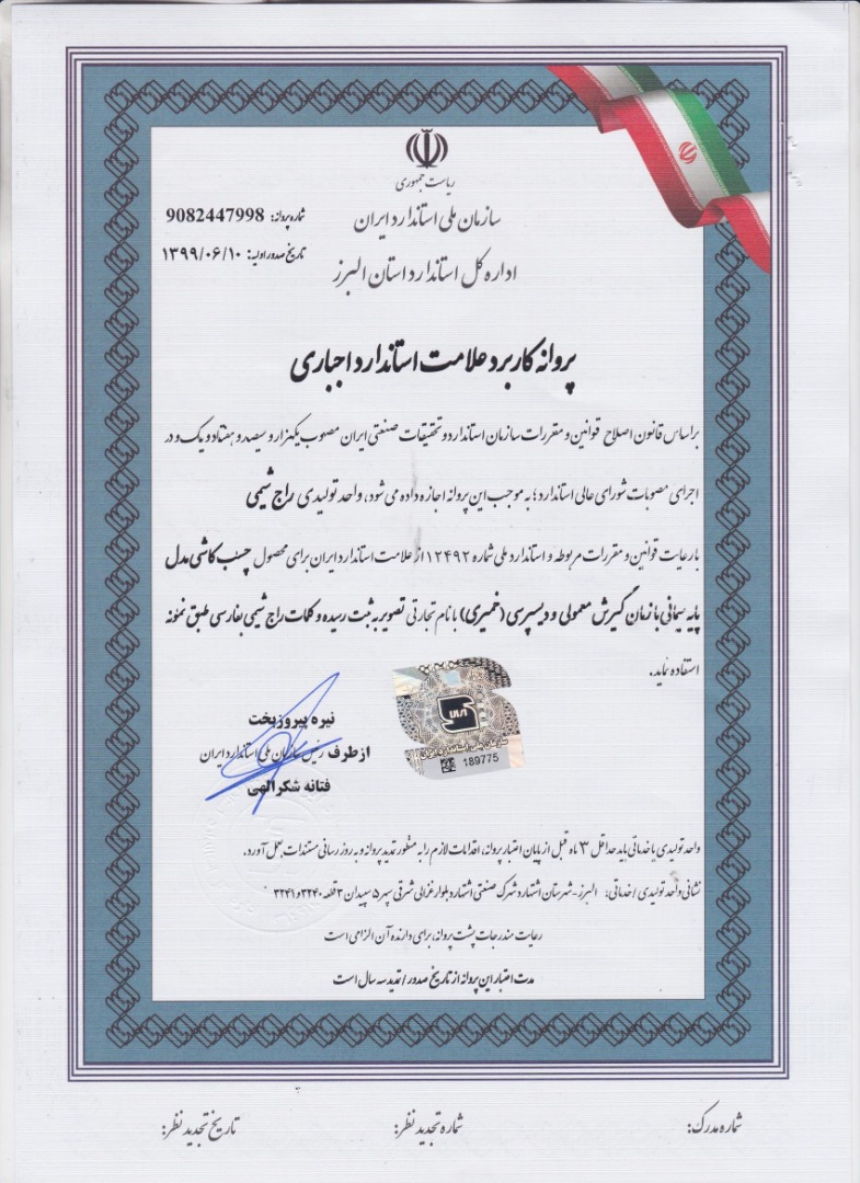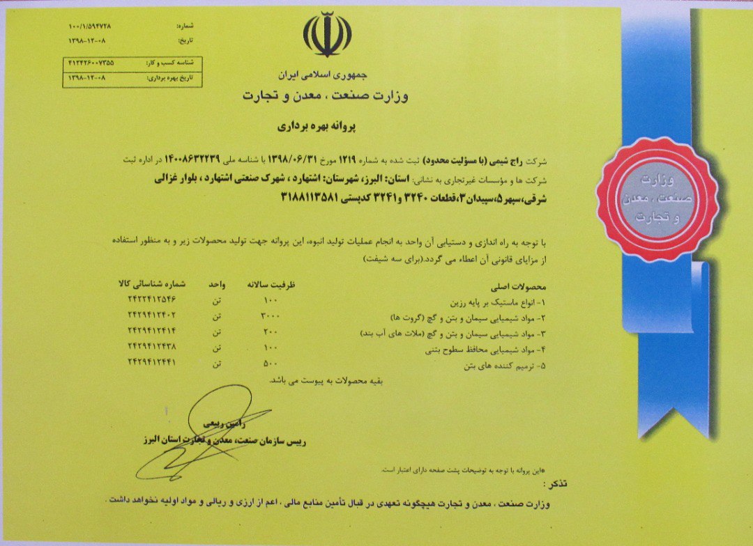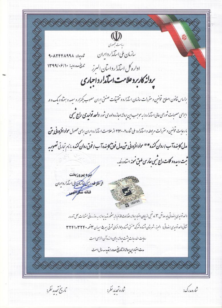 راج شیمی مدیران شرکت راج شیمی با بیش از 30سال تجربه در زمینه تولید مواد شیمیایی صنعت ساختمان با توکل به خداوند متعال اخیرا اقدام به تاسیس واحدی جدید در شهرک صنعتی اشتهارد نموده اند.بهره گیری از واحد تولیدی مجهز ، تجارب پرسنل متخصص ،کنترل کیفی مجرب و استفاده از تکنولوژی روز دنیا ، تولید مواد شیمیایی ساختمان با کیفیت را سرلوحه کار خود قرار داده و همکاری با موسسات علمی و پژوهشی کشور باعث افزایش کیفیت محصولات این شرکت گردیده است.لازم بذکر است این شرکت دارای گواهینامه های استاندارد اجباری ملی ایران (افزودنی های بتن ISIRI 2930 و چسب های کاشی ISIRI 12492) ، عضو رسمی انجمن تولیدکنندگان مواد شیمیایی صنعت ساختمان و همچنین جزء وندور لیست شرکت نفت می باشد.